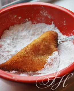 Cool for a couple of minutes, drop into confectioners sugar and coat all over.